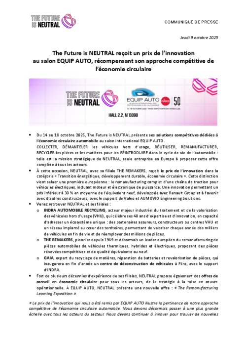 The Future is Neutral présente ses solutions compétitives dédiées à l’économie circulaire automobile au salon international Equip Auto. Collecter, démanteler les véhicules hors d’usage, réutiliser, remanufacturer, recycler les pièces et les matières pour les réintroduire dans le cycle de vie de l’automobile : telle est la mission stratégique de Neutral, seule entreprise en Europe à proposer cette offre complète à tous les acteurs.