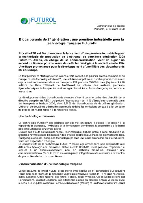 Procethol 2G est fier d’annoncer le lancement d’une première industrielle pour la technologie de production de bioéthanol de deuxième génération (2G) Futurol. Axens, en charge de sa commercialisation, vient de signer un accord de licence pour la vente de cette technologie à la société croate INA. Une étape prometteuse pour le développement d’une filière des biocarburants 2G en Europe.