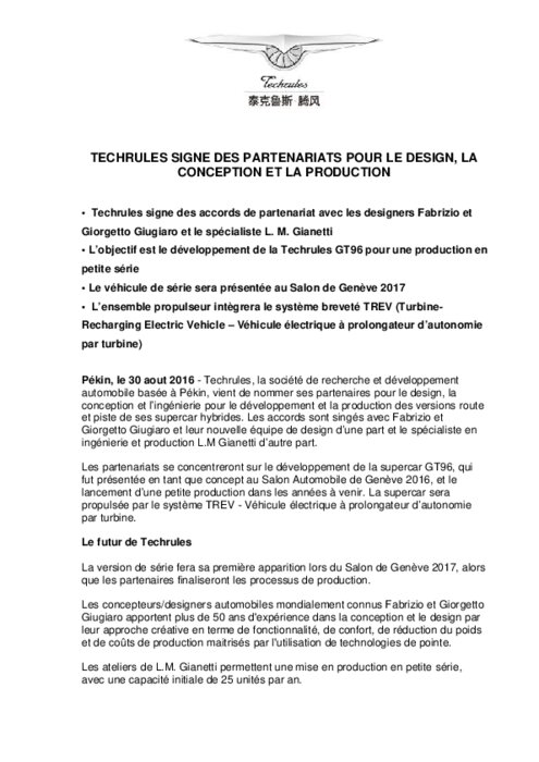 Techrules, la société de recherche et développement automobile basée à Pékin, vient de nommer ses partenaires pour le design, la conception et l’ingénierie pour le développement et la production des versions route et piste de ses supercar hybrides. Les accords sont singés avec Fabrizio et Giorgetto Giugiaro et leur nouvelle équipe de design d’une part et le spécialiste en ingénierie et production L.M Gianetti d’autre part.