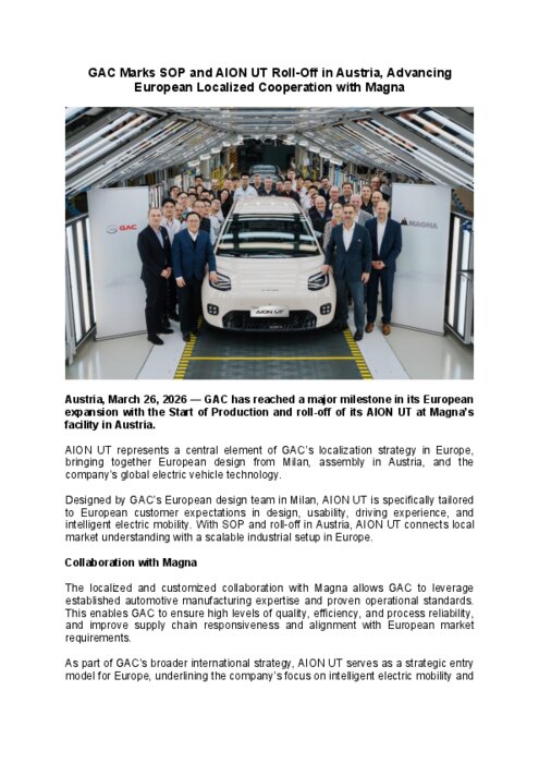 GAC a franchi une étape majeure dans son expansion européenne avec le lancement de la production et la sortie de la chaîne de montage de son AION UT dans l'usine de Magna en Autriche. L'AION UT représente un élément central de la stratégie de localisation de GAC en Europe, alliant un design européen conçu à Milan, un assemblage en Autriche et la technologie mondiale de véhicules électriques de l'entreprise.