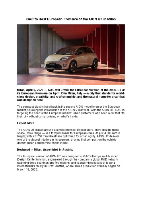 Constructeurs 09 avril 2026 - 10:56 GAC dévoilera la version européenne de l'AION UT lors de sa première européenne le 13 avril à Milan, en Italie, une ville synonyme de design, de créativité et de savoir-faire de classe mondiale, et le lieu idéal pour une voiture qui y a été conçue. PDF (435 Ko) Télécharger credit GAC