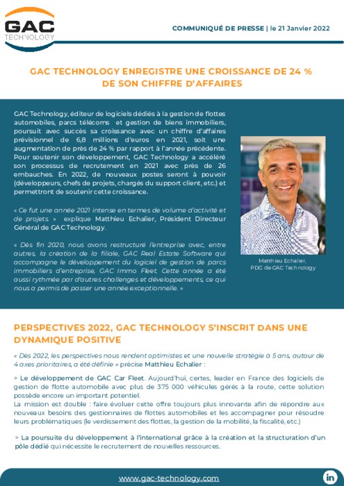 GAC Technology, éditeur de logiciels dédiés à la gestion de flottes automobiles, parcs télécoms et gestion de biens immobiliers, poursuit avec succès sa croissance avec un chiffre d’affaires prévisionnel de 6,8 millions d’euros en 2021, soit une augmentation de près de 24 % par rapport à l’année précédente. Pour soutenir son développement, GAC Technology a accéléré son processus de recrutement en 2021 avec près de 26 embauches. En 2022, de nouveaux postes seront à pouvoir...