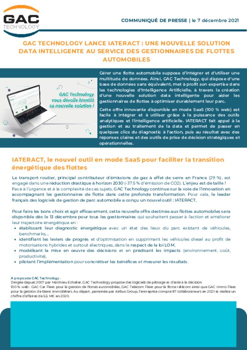 Gérer une flotte automobile suppose d’intégrer et d’utiliser une multitude de données. Ainsi, GAC Technology, qui dispose d’une base de données sans équivalent, met à profit son expertise dans les technologies d’Intelligence Artificielle, à travers la création d’une nouvelle solution data intelligente pour aider les gestionnaires de flottes à optimiser durablement leur parc. Cette offre innovante disponible en mode SaaS (100 % web) est facile à intégrer et à utiliser...