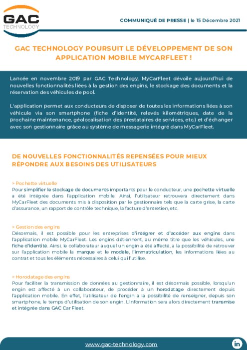 Lancée en novembre 2019 par GAC Technology, MyCarFleet dévoile de nouvelles fonctionnalités liées à la gestion des engins, le stockage des documents et la réservation des véhicules de pool. L'application permet aux conducteurs de disposer de toutes les informations liées à son véhicule via son smartphone (fiche d’identité, relevés kilométriques, date de la prochaine maintenance, géolocalisation des prestataires de services, etc.) et d’échanger avec son gestionnaire...