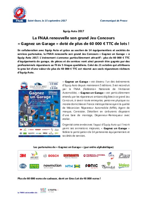 En collaboration avec Equip Auto et grâce au soutien de 14 équipementiers et sociétés de services partenaires, la FNAA renouvelle son grand Jeu Concours " Gagnez un Garage " à Equip Auto 2017. L’événement s’annonce particulièrement attractif : plus de 60 000 € TTC d’équipements de garage, de pièces et de services vont ainsi pouvoir être gagnés par des professionnels réparateurs au fil de 5 tirages quotidiens...