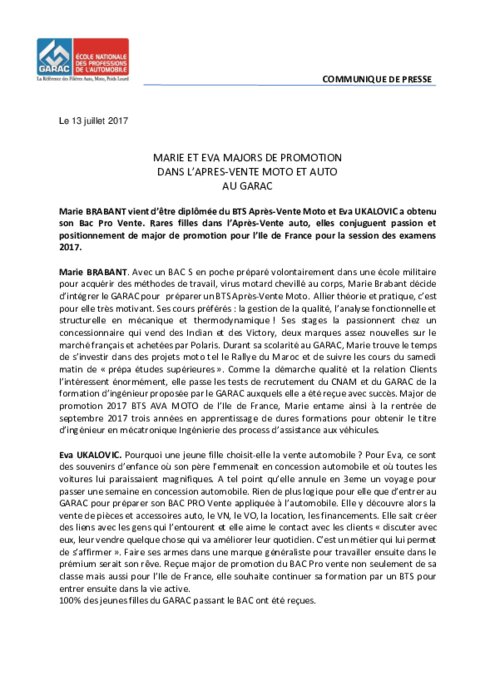 Marie Brabant vient d'être diplômée du BTS Après-Vente Moto et Eva UKALOVIC a obtenu son Bac Pro Vente. Rares filles dans l'Après-Vente auto, elles conjuguent passion et positionnement de major de promotion pour l'Ile de France pour la session des examens 2017.