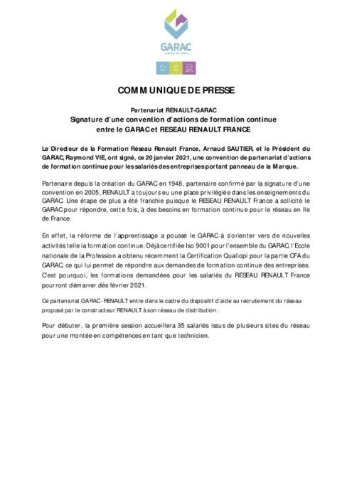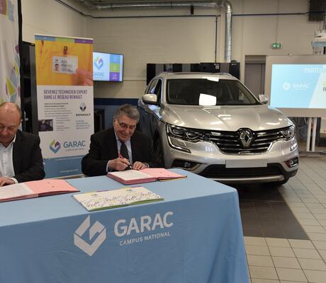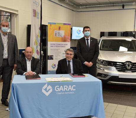 Le Directeur de la Formation Réseau Renault France, Arnaud SAUTIER, et le Président du GARAC, Raymond VIE, ont signé, ce 20 janvier 2021, une convention de partenariat d'actions de formation continue pour les salariés des entreprises portant panneau de la Marque.