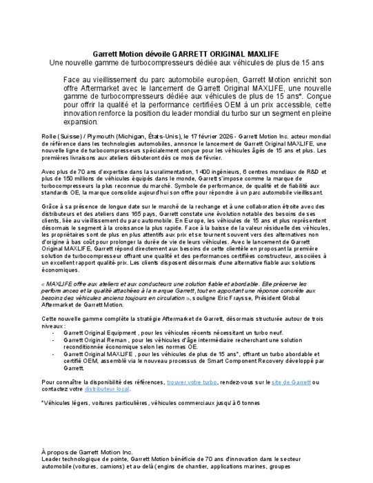 Face au vieillissement du parc automobile européen, Garrett Motion enrichit son offre Aftermarket avec le lancement de Garrett Original MAXLIFE, une nouvelle gamme de turbocompresseurs dédiée aux véhicules de plus de 15 ans*. Conçue pour offrir la qualité et la performance certifiées OEM à un prix accessible, cette innovation renforce la position du leader mondial du turbo sur un segment en pleine expansion.