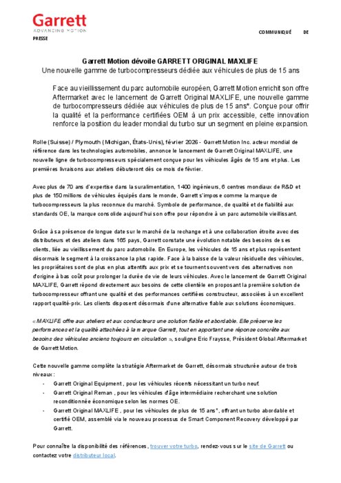 Face au vieillissement du parc automobile européen, Garrett Motion enrichit son offre Aftermarket avec le lancement de Garrett Original MAXLIFE, une nouvelle gamme de turbocompresseurs dédiée aux véhicules de plus de 15 ans. Conçue pour offrir la qualité et la performance certifiées OEM à un prix accessible, cette innovation renforce la position du leader mondial du turbo sur un segment en pleine expansion.