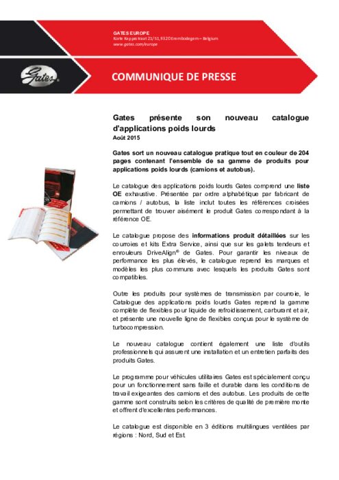 Equipementiers 31 août 2015 - 17:21 Gates présente un nouveau catalogue pratique tout en couleur de 204 pages contenant l’ensemble de sa gamme de produits pour applications poids lourds (camions et autobus). PDF (147 Ko) Télécharger