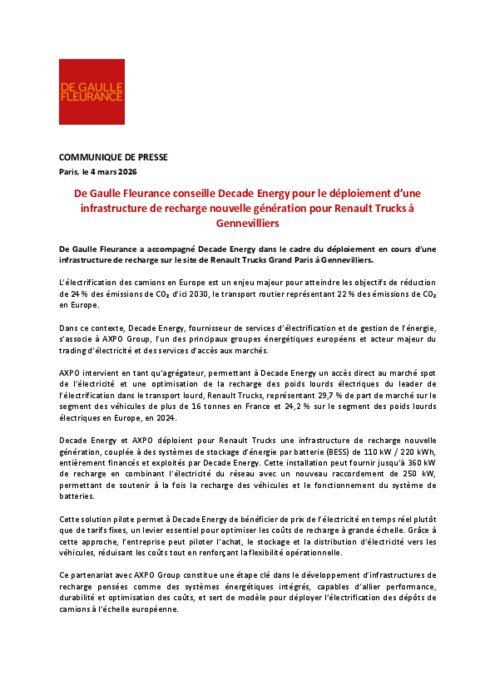 Constructeurs, Services 04 mars 2026 - 10:57 L’électrification des camions en Europe est un enjeu majeur pour atteindre les objectifs de réduction de 24 % des émissions de CO₂ d’ici 2030, le transport routier représentant 22 % des émissions de CO₂ en Europe. PDF (360 Ko) Télécharger credit De Gaulle Fleurance