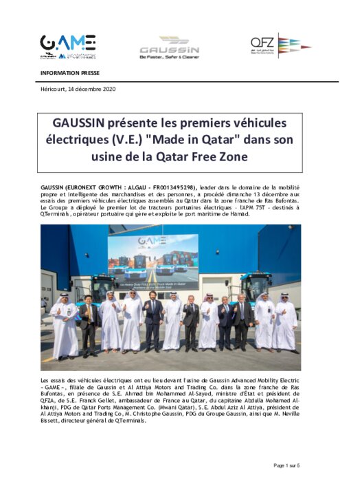 Gaussin, leader dans le domaine de la mobilité propre et intelligente des marchandises et des personnes, a procédé dimanche 13 décembre aux essais des premiers véhicules électriques assemblés au Qatar dans la zone franche de Ras Bufontas. Le Groupe a déployé le premier lot de tracteurs portuaires électriques - l'APM 75T - destinés à QTerminals, opérateur portuaire qui gère et exploite le port maritime de Hamad.
