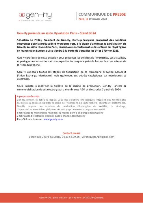 Sébastien Le Pollès, Président de Gen-Hy, start-up française proposant des solutions innovantes pour la production d’hydrogène vert, a le plaisir d’annoncer la participation de Gen-Hy au salon Hyvolution Paris, rendez-vous incontournable des acteurs de l’hydrogène en France et en Europe, qui se tiendra à la Porte de Versailles les 1er et 2 février 2023.