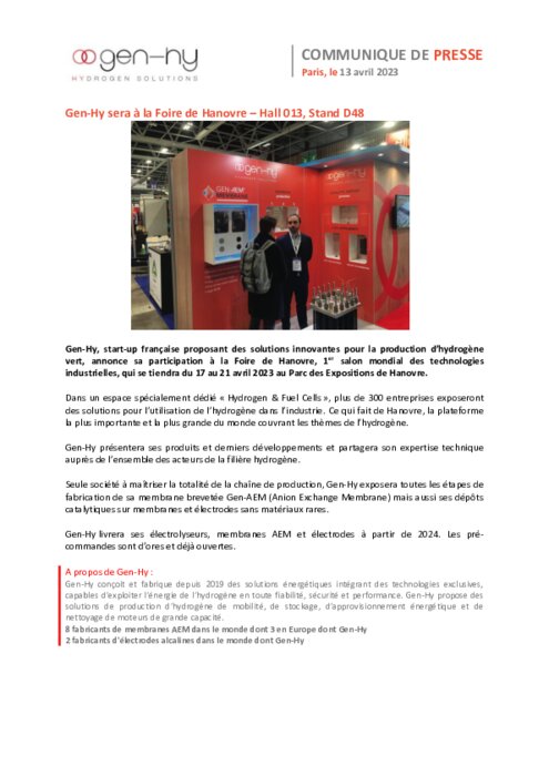 Gen-Hy, start-up française proposant des solutions innovantes pour la production d’hydrogène vert, annonce sa participation à la Foire de Hanovre, 1er salon mondial des technologies industrielles, qui se tiendra du 17 au 21 avril 2023 au Parc des Expositions de Hanovre.