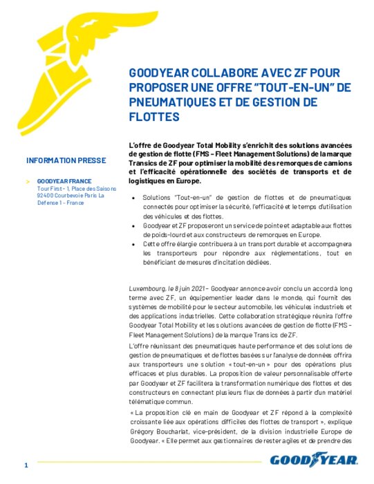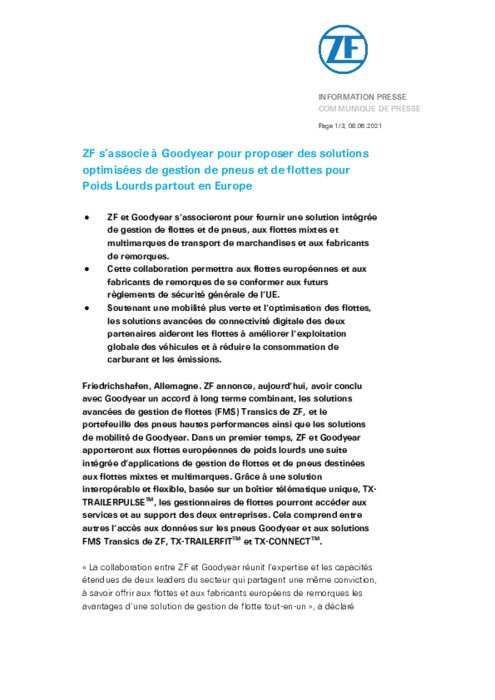 ZF annonce, avoir conclu avec Goodyear un accord à long terme combinant, les solutions avancées de gestion de flottes (FMS) Transics de ZF, et le portefeuille des pneus hautes performances ainsi que les solutions de mobilité de Goodyear. Dans un premier temps, ZF et Goodyear apporteront aux flottes européennes de poids lourds une suite intégrée d'applications de gestion de flottes et de pneus destinées aux flottes mixtes et multimarques...