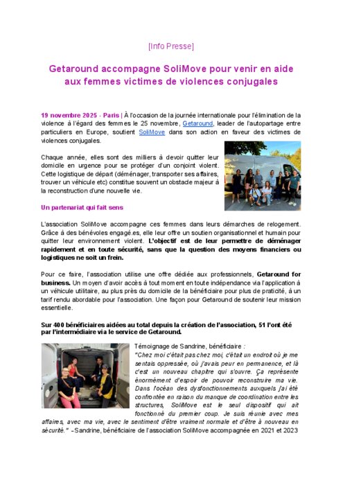 À l’occasion de la journée internationale pour l’élimination de la violence à l’égard des femmes le 25 novembre, Getaround, leader de l’autopartage entre particuliers en Europe, soutientSoliMovedans son action en faveur des victimes de violences conjugales.