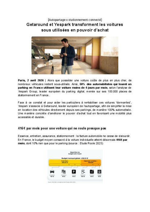 Alors que posséder une voiture coûte de plus en plus cher, de nombreux véhicules restent sous-utilisés. Ainsi, 50% des automobilistes qui louent un parking en France utilisent leur voiture moins de 4 jours par mois, selon l’analyse de Yespark Group, leader européen du parking digital, menée sur ses 100.000 places de stationnement en France. Face à ce constat et pour aider les particuliers à rentabiliser ces voitures “dormantes”, Yespark s’associe à Getaround, leader européen de l’autopartage, afin de simplifier la mise en location des véhicules directement depuis ses parkings, de manière 100% automatisée.