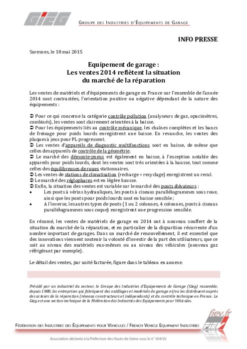 En résumé, les ventes de matériels de garage en 2014 ont à nouveau souffert de la situation du marché de la réparation, et en particulier de la disparition récurrente d'un nombre important de garages. Dans un marché de renouvellement, il est essentiel que des innovations viennent soutenir la volonté d'investir la part des utilisateurs, que ce soit au niveau des matériels eux même ou niveau des véhicules ( nouveau gaz réfrigérant par exemple).