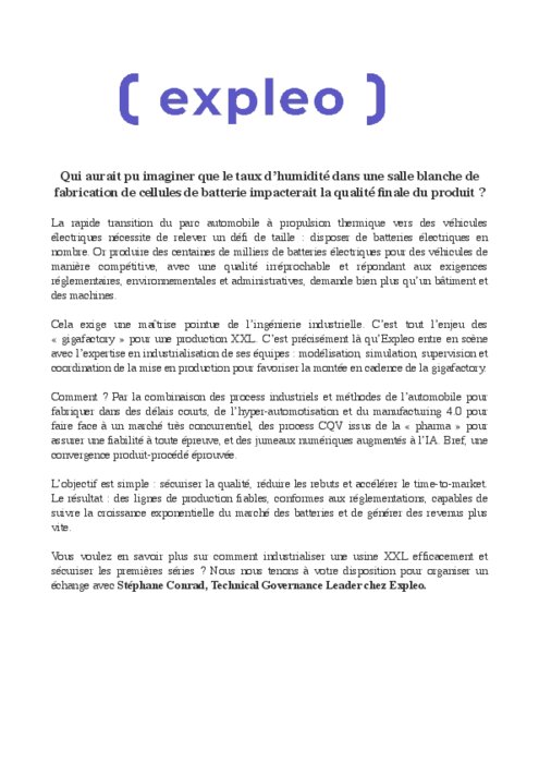 La rapide transition du parc automobile à propulsion thermique vers des véhicules électriques nécessite de relever un défide taille : disposer de batteries électriques en nombre. Or produire des centaines de milliers de batteries électriques pour des véhicules de manière compétitive, avec une qualitéirréprochable et répondant aux exigences réglementaires, environnementales et administratives, demande bien plus qu’un bâtiment et des machines.