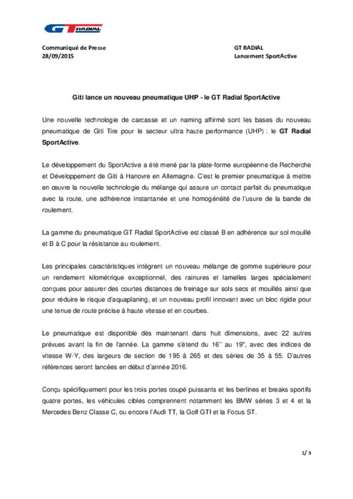 Une nouvelle technologie de carcasse et un naming affirmé sont les bases du nouveau pneumatique de Giti Tire pour le secteur ultra haute performance (UHP) : le GT Radial SportActive. Le développement du SportActive a été mené par la plate-forme européenne de Recherche et Développement de Giti à Hanovre en Allemagne. C’est le premier pneumatique à mettre en œuvre la nouvelle technologie du mélange qui assure un contact parfait du pneumatique avec la route et une adhérence instantanée.