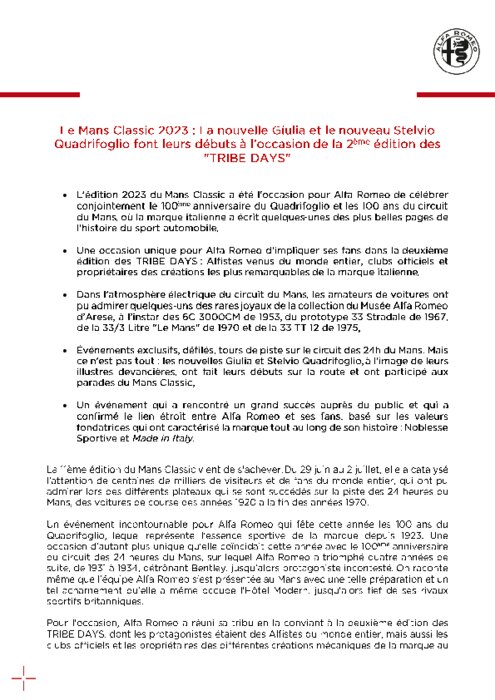 La 11e édition du Mans Classic vient de s'achever. Du 29 juin au 2 juillet, elle a catalysé l'attention de centaines de milliers de visiteurs et de fans du monde entier, qui ont pu admirer lors des différents plateaux qui se sont succédés sur la piste des 24 heures du Mans, des voitures de course des années 1920 à la fin des années 1970. Un événement incontournable pour Alfa Romeo qui fête cette année les 100 ans du Quadrifolglio, lequel représente l'essence sportive de la marque depuis 1923.