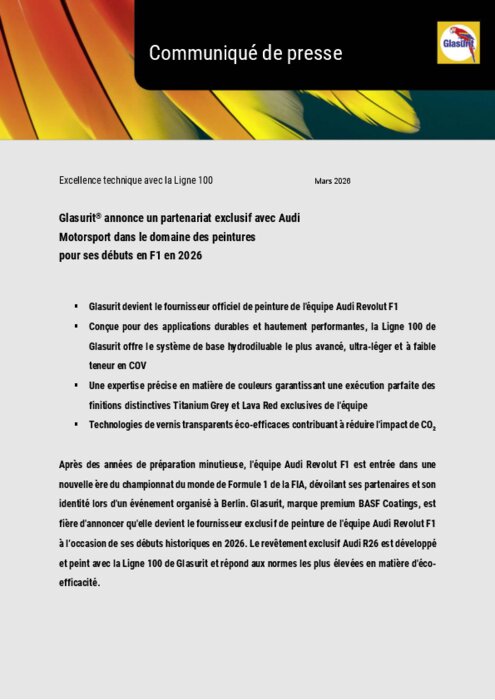 Après des années de préparation minutieuse, l'équipe Audi Revolut F1 est entrée dans une nouvelle ère du championnat du monde de Formule 1 de la FIA, dévoilant ses partenaires et son identité lors d'un événement organisé à Berlin. Glasurit est fière d'annoncer qu'elle devient le fournisseur exclusif de peinture de l'équipe Audi Revolut F1 à l’occasion de ses débuts historiques en 2026. Le revêtement exclusif Audi R26 est développé et peint avec la Ligne 100 de Glasurit et répond aux normes les plus élevées en matière d'éco-efficacité.