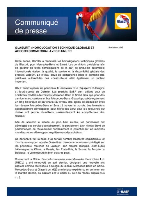 Cette année, Daimler a renouvelé les homologations techniques globales de Glasurit, pour Mercedes-Benz et Smart. Les conditions préalables afin de garantir de telles homologations de la part de l'industrie automobile internationale étaient la qualité, le service et la disponibilité globale des produits Glasurit. Le niveau élevé de compétence dans le domaine des peintures automobiles des constructeurs était également un facteur important.