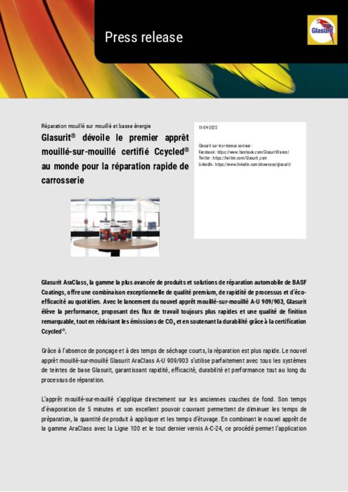 Avec le lancement du nouvel apprêt mouillé-sur-mouillé A-U 909/903, Glasurit élève la performance, proposant des flux de travail toujours plus rapides et une qualité de finition remarquable, tout en réduisant les émissions de CO₂ et en soutenant la durabilité grâce à la certification Ccycled.