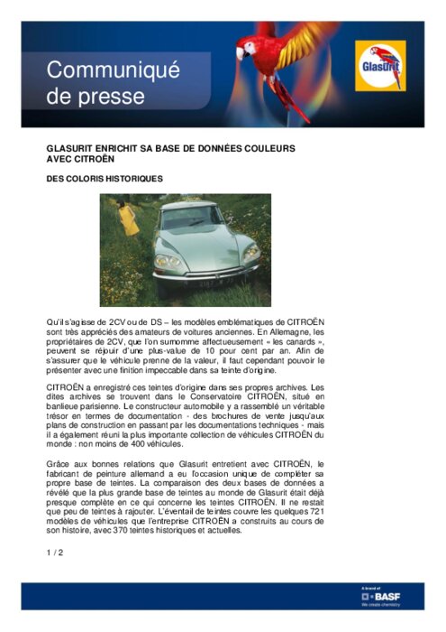 Grâce aux bonnes relations que Glasurit entretient avec CITROËN, le fabricant de peinture allemand a eu l’occasion unique de compléter sa propre base de teintes. La comparaison des deux bases de données a révélé que la plus grande base de teintes au monde de Glasurit était déjà presque complète en ce qui concerne les teintes CITROËN. Il ne restait que peu de teintes à rajouter. L’éventail de teintes couvre les quelques 721 modèles de véhicules que l’entreprise CITROËN a construits.