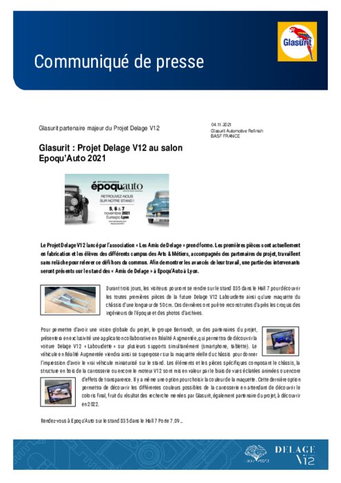 Le Projet Delage V12 lancé par l’association « Les Amis de Delage » prend forme. Les premières pièces sont actuellement en fabrication et les élèves des différents campus des Arts & Métiers, accompagnés des partenaires du projet, travaillent sans relâche pour relever ce défi hors du commun. Afin de montrer les avancés de leur travail, une partie des intervenants seront présents sur le stand des « Amis de Delage » à Epoqu’Auto à Lyon.