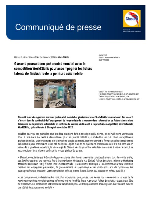 Glasurit vient de signer un nouveau partenariat mondial et pluriannuel avec WorldSkills International. Cet accord s’inscrit dans la continuité de l’engagement de longue date de la marque dans la formation de futurs talents dans l’industrie de la peinture automobile et confirme le soutien de Glasurit à la prochaine compétition internationale WorldSkills, qui se tiendra à Shanghai en octobre 2022.