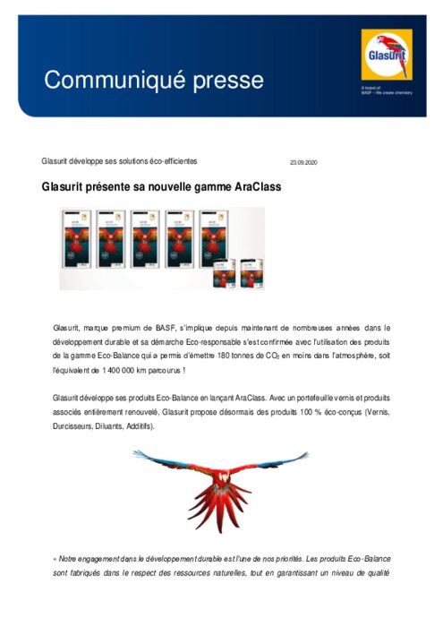 Glasurit s’implique depuis maintenant de nombreuses années dans le développement durable et développe ses produits Eco-Balance en lançant aujourd'hui AraClass. Avec un portefeuille vernis et produits associés entièrement renouvelé, Glasurit propose désormais des produits 100 % éco-conçus (Vernis, Durcisseurs, Diluants, Additifs).