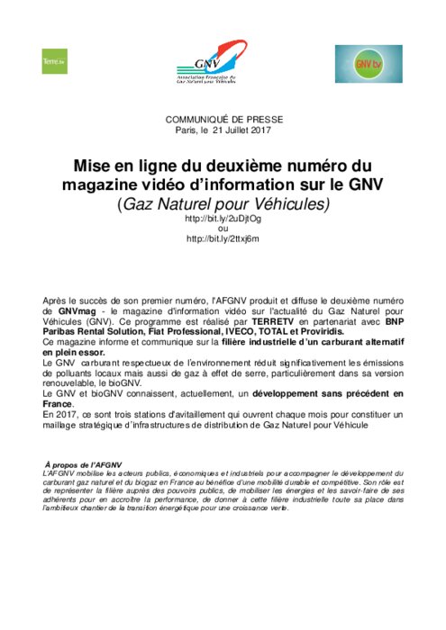 Après le succès de son premier numéro, l'AFGNV produit et diffuse le deuxième numéro de GNVmag - le magazine d'information vidéo sur l'actualité du Gaz Naturel pour Véhicules (GNV). Ce programme est réalisé par TERRETV en partenariat avec BNP Paribas Rental Solution, Fiat Professional, IVECO, TOTAL et Proviridis. Ce magazine informe et communique sur la filière industrielle d’un carburant alternatif en plein essor.