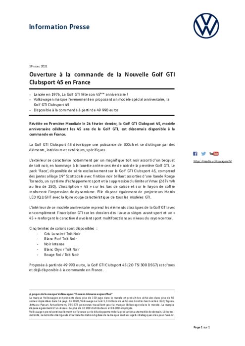 Révélée en Première Mondiale le 26 février dernier, la Golf GTI Clubsport 45, modèle anniversaire célébrant les 45 ans de la Golf GTI, est désormais disponible à la commande en France. La Golf GTI Clubsport 45 développe une puissance de 300ch et se distingue par des éléments, intérieurs et extérieurs, spécifiques.