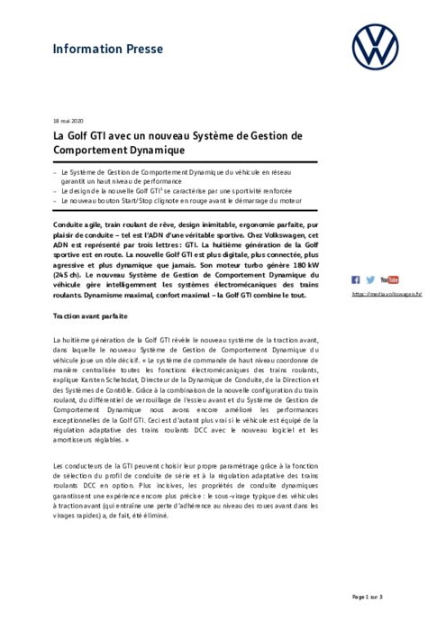 Golf GTI: nouveau Système de Gestion de Comportement Dynamique