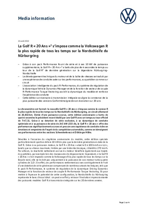 Le chronomètre est formel : la nouvelle Golf R « 20 Ans » s’impose comme la version R la plus rapide de tous les temps sur la Nordschleife du Nürburgring, un circuit allemand de 20,832 km. Dotée d’une puissance accrue, cette édition anniversaire a battu de quatre secondes le précédent record établi par une Golf R avec un temps au tour officiel de 7:47,31. Grâce à sa dotation de série exclusive, à sa dynamique de conduite optimisée et à sa puissance de série de 245 kW, la Golf R "20 Ans".