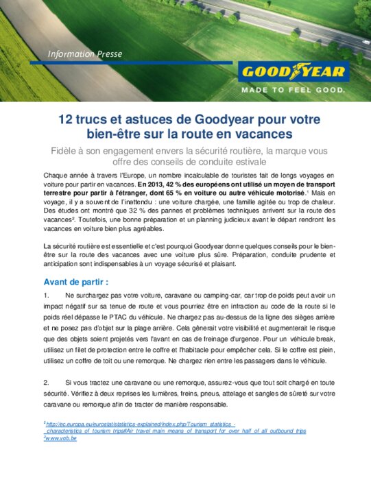 Chaque année à travers l'Europe, un nombre incalculable de touristes fait de longs voyages en voiture pour partir en vacances. En 2013, 42 % des européens ont utilisé un moyen de transport terrestre pour partir à l'étranger, dont 65 % en voiture ou autre véhicule motorisé. Des études ont montré que 32 % des pannes et problèmes techniques arrivent sur la route des vacances. Fidèle à son engagement envers la sécurité routière, la marque offre des conseils de conduite estivale.