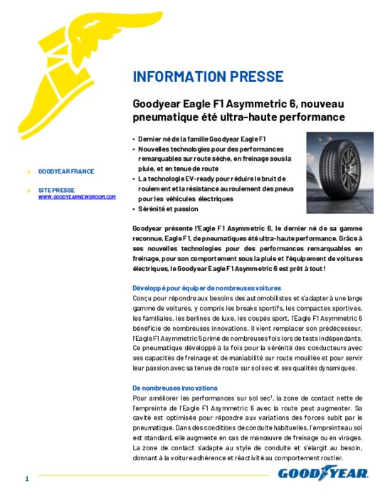 Goodyear présente l’Eagle F1 Asymmetric 6, le dernier né de sa gamme reconnue, Eagle F1, de pneumatiques été ultra-haute performance. Grâce à ses nouvelles technologies pour des performances remarquables en freinage, pour son comportement sous la pluie et l’équipement de voitures électriques, le Goodyear Eagle F1 Asymmetric 6 est prêt à tout !