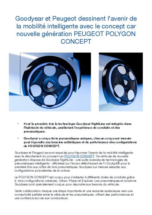 Goodyear et Peugeot se sont associés pour façonner l'avenir de la mobilité intelligente avec le dévoilement du concept-car POLYGON CONCEPT. Ce véhicule de nouvelle génération dispose de Goodyear SightLine - une suite avancée de technologies de pneumatiques intelligents - affichées sur l’écran réfléchissant de l’i-Cockpit® pour la première fois aux côtés de trois pneumatiques Goodyear sur mesure adaptés aux configurations polyvalentes de la voiture.