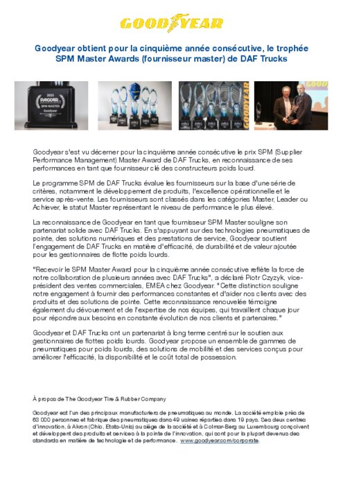 Goodyear obtient pour la 5e année consécutive, le trophée SPM Master Awards