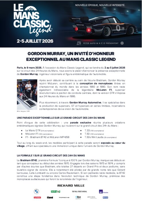 À l’occasion du Mans Classic Legend, qui se tiendra du 2 au 5 juillet 2026sur le circuit des 24 Heures du Mans, nous avons le plaisir d’annoncer la présence exceptionnelle de Gordon Murray, ingénieur visionnaire et figure emblématique de l’automobile.