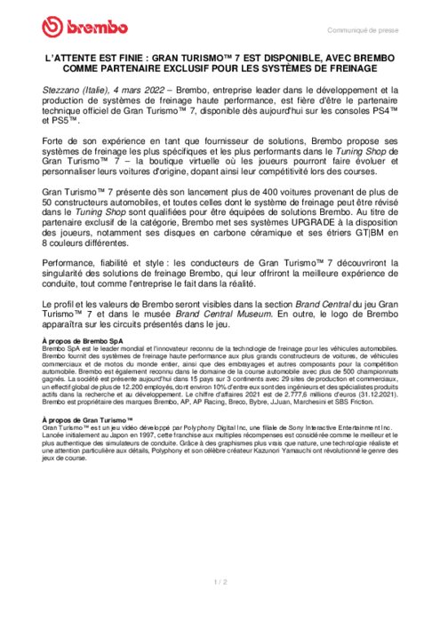 Brembo, entreprise leader dans le développement et la production de systèmes de freinage haute performance, est fière d'être le partenaire technique officiel de Gran Turismo 7, disponible dès aujourd'hui sur les consoles PS4 et PS5. Forte de son expérience en tant que fournisseur de solutions, Brembo propose ses systèmes de freinage les plus spécifiques et les plus performants dans le Tuning Shop de Gran Turismo 7...