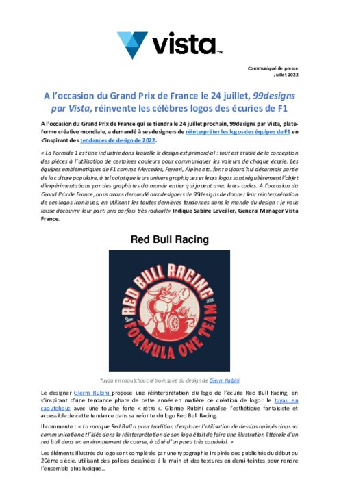 Constructeurs, Services 19 juillet 2022 - 11:29 A l’occasion du Grand Prix de France qui se tiendra le 24 juillet prochain, 99designs par Vista, plateforme créative mondiale, a demandé à ses designers de réinterpréter les logos des équipes de F1 en s’inspirant des tendances de design de 2022. PDF (683 Ko) Télécharger