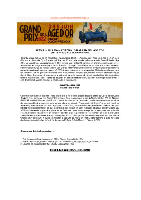 Le circuit de Dijon Prenois qui fête ses 50 ans cette année, à l’occasion du Grand Prix de l’Âge d’Or. Le court tracé bourguignon de 3 800 mètres s’est présenté comme un challenge redoutable avec, notamment le virage en aveugle de la Bretelle, l’épingle Parabolique en montée ou la très rapide et interminable courbe de Pouas. Malgré des alertes météo peu rassurantes et un ciel menaçant une bonne
