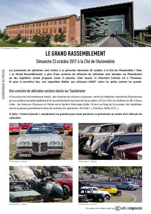 Les passionnés de cylindrées sont invités à se présenter dimanche 22 octobre à la Cité de l’Automobile ! Pour " Le Grand Rassemblement ", plus d’une centaine de véhicules de collection sont attendus sur l’Autodrome où des baptêmes seront proposés toute la journée. Côté musée, la Chevrolet Camaro est à l’honneur. Et pour la première fois, une exposition dédiée aux véhicules LEGO ravira les petits comme les grands.