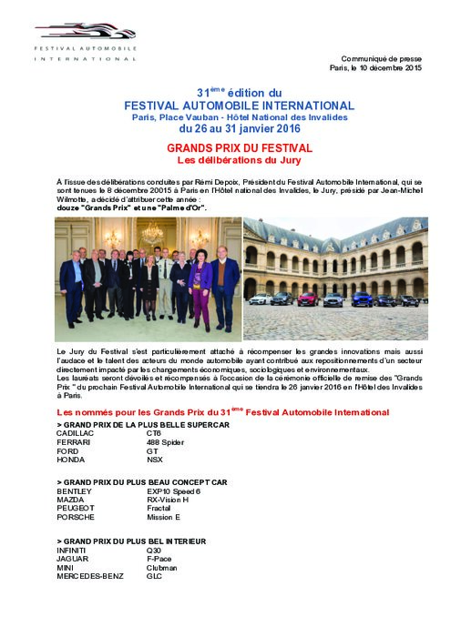 À l’issue des délibérations conduites par Rémi Depoix, Président du Festival Automobile International, qui se sont tenues le 8 décembre 20015 à Paris en l’Hôtel national des Invalides, le Jury, présidé par Jean-Michel Wilmotte, a décidé d’attribuer cette année : douze "Grands Prix" et une "Palme d'Or".