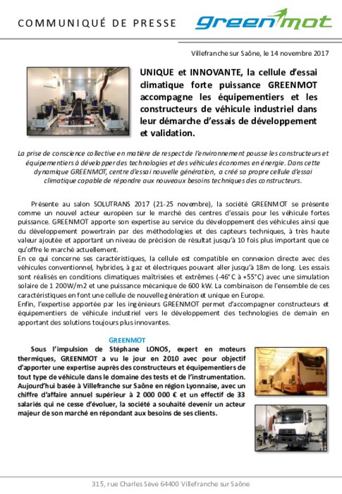 Présente au salon SOLUTRANS 2017 (21-25 novembre), la société GREENMOT se présente comme un nouvel acteur européen sur le marché des centres d'essais pour les véhicule fortes puissance. GREENMOT apporte son expertise au service du développement des véhicules ainsi que du développement powertrain par des méthodologies et des capteurs techniques, à très haute valeur ajoutée et apportant un niveau de précision de résultat jusqu'à 10 fois plus important que ce qu'offre le marché actuellement.