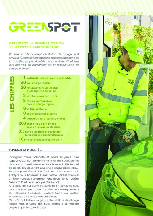 Services 07 février 2017 - 14:32 En inventant le concept de station de charge multi services, Greenspot propose une nouvelle approche de la mobilité : propre, durable, personnalisée, conforme aux attentes du consommateur et respectueuse de l’environnement. PDF (2 Mo) Télécharger