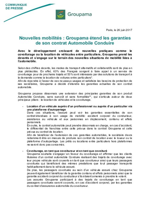 Services 27 juin 2017 - 11:53 Groupama propose désormais une extension des principales garanties de son produit Automobile Conduire, sans surcoût et sans formalités, qui s’articule autour de deux principaux piliers : la location de véhicules et le covoiturage. PDF (1 Mo) Télécharger