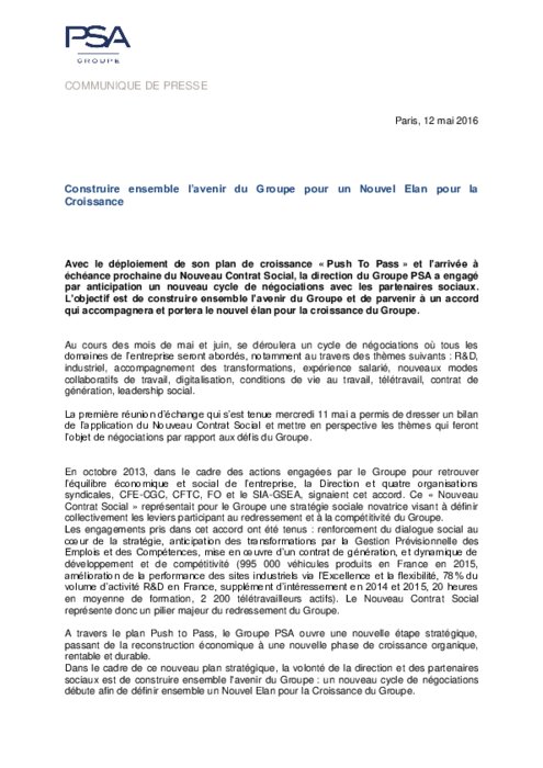 Avec le déploiement de son plan de croissance " Push To Pass " et l'arrivée à échéance prochaine du Nouveau Contrat Social, la direction du Groupe PSA a engagé par anticipation un nouveau cycle de négociations avec les partenaires sociaux. L'objectif est de construire ensemble l'avenir du Groupe et de parvenir à un accord qui accompagnera et portera le nouvel élan pour la croissance du Groupe.
